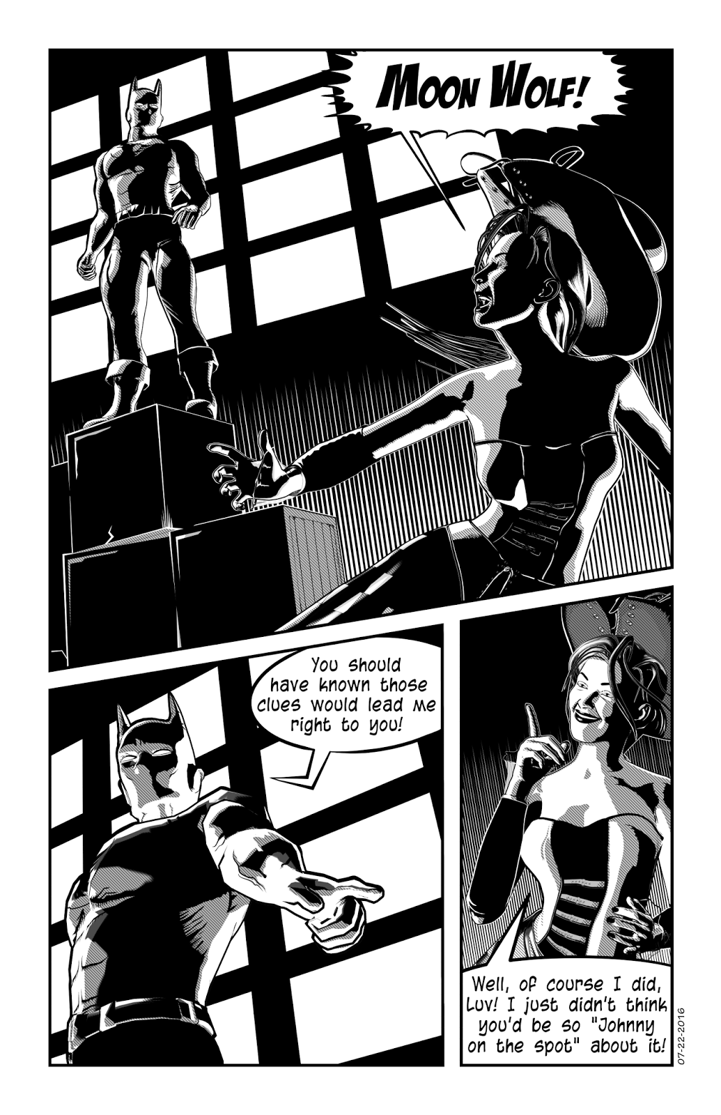 Since my finished art includes a solid black area and a secondary gray area, I usually start with the black render: It's usually got small, tightly defined areas of shadow, and I pay special attention to casting light on the jawline because it gives the figure shape.